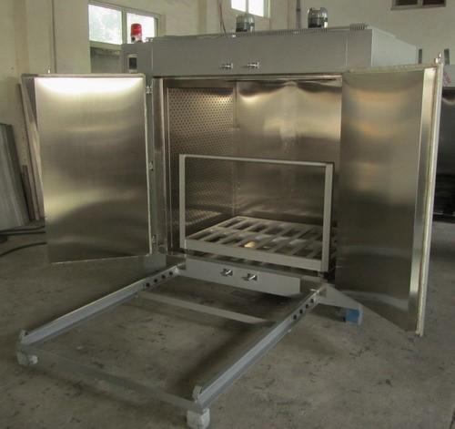 台车装有驱动装置,开启开关后便可自动进出。该箱工作温度可由室温至最高使用温度,在此范围内可任意选定所需温度恒温后可借电气控制系统自动控制温度。工作室左右侧装有加热器及风道,工作室顶部有鼓风机,由鼓风机将箱内空气通过风道进行机械对流,使工作室温度均匀一致。烘箱的温度控制采用电子温度调节自动控制,热电偶传感器。