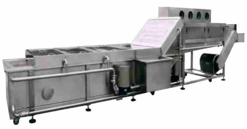 物料在槽内网链上输送的同时,在气泡、水浪的作用下对物料初洗,物料在提升网链上经高压水再次喷淋冲洗。清洗后的物料输送到风干区,经多个风刀吹动,脱去物料表面的水珠和水液,无明显滴水现象。